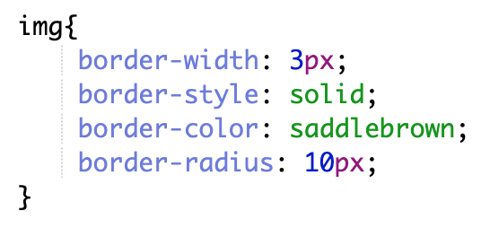 Styling images' borders is very common. There are many border properties you can use. For example, border-width controls the thickness of the border, border-style determines whether it is solid or dashed, border-color determines its color, and border-radius determines how round its corners are. Here's an example: